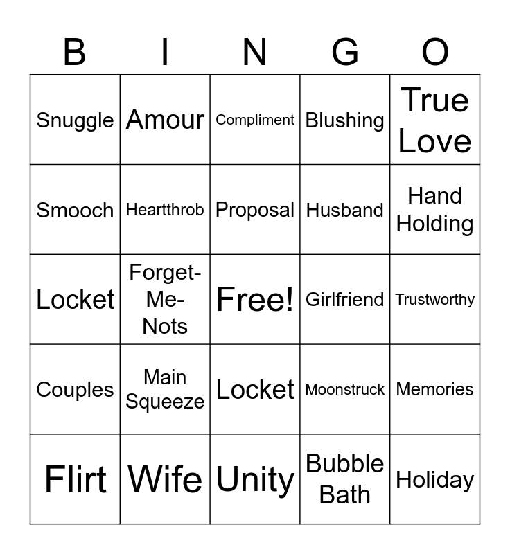 This bingo card has a free space and 34 words: Chivalry, Bubble Bath, Smile, Soul Mates, Couples, Heartthrob, True Love, Flirt, Amour, Champagne, Proposal, Compliment, My Funny Valentine, Diamond, Girlfriend, Hand Holding, Wife, Locket, Main Squeeze, Moonstruck, Locket, Puppy Love, Snuggle, Trustworthy, Unity, Holiday, Blushing, Boyfriend, Husband, Smooch, Spouse, Forget-Me-Nots, Memories and Crush.