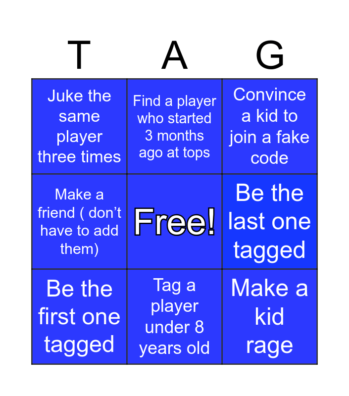 This bingo card has a free space and 8 words: Be the last one tagged, Convince a kid to join a fake code, Find a player who started 3 months ago at tops, Be the first one tagged, Juke the same player three times, Make a kid rage, Make a friend ( don’t have to add them) and Tag a player under 8 years old.