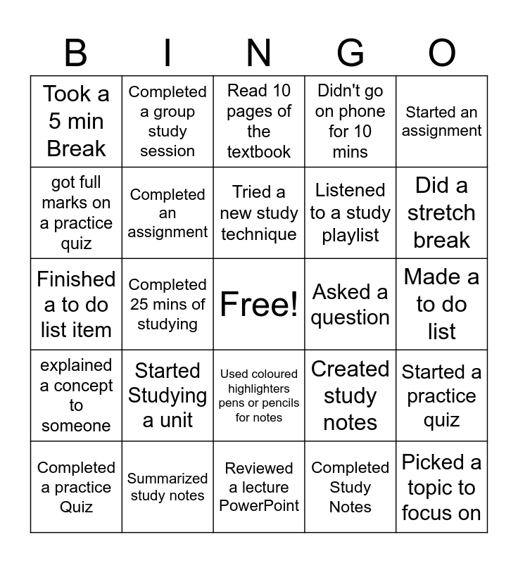 This bingo card has a free space and 24 words: Completed a practice Quiz, Started Studying a unit, Tried a new study technique, Completed Study Notes, Started an assignment, Took a 5 min Break, Completed a group study session, Read 10 pages of the textbook, Asked a question, Made a to do list, Finished a to do list item, Completed an assignment, Created study notes, Started a practice quiz, got full marks on a practice quiz, Summarized study notes, Reviewed a lecture PowerPoint, Didn't go on phone for 10 mins, Did a stretch break, explained a concept to someone, Completed 25 mins of studying, Used coloured highlighters pens or pencils for notes, Listened to a study playlist and Picked a topic to focus on.