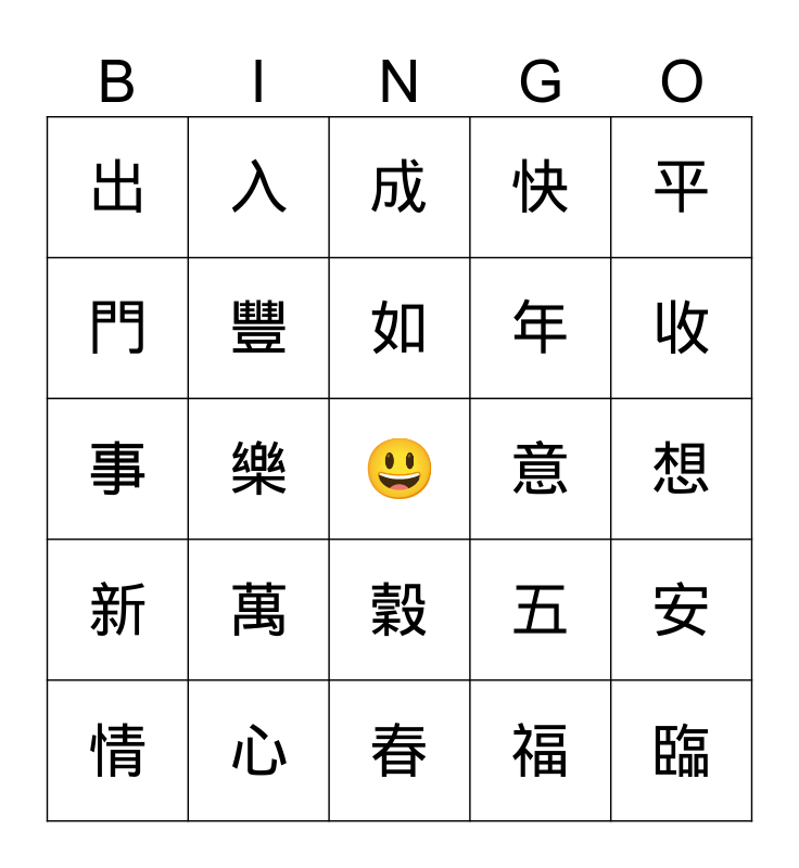 This bingo card has a free space and 24 words: 萬, 心, 如, 情, 平, 出, 門, 入, 意, 穀, 年, 事, 五, 安, 豐, 福, 想, 成, 收, 樂, 臨, 新, 快 and 春.