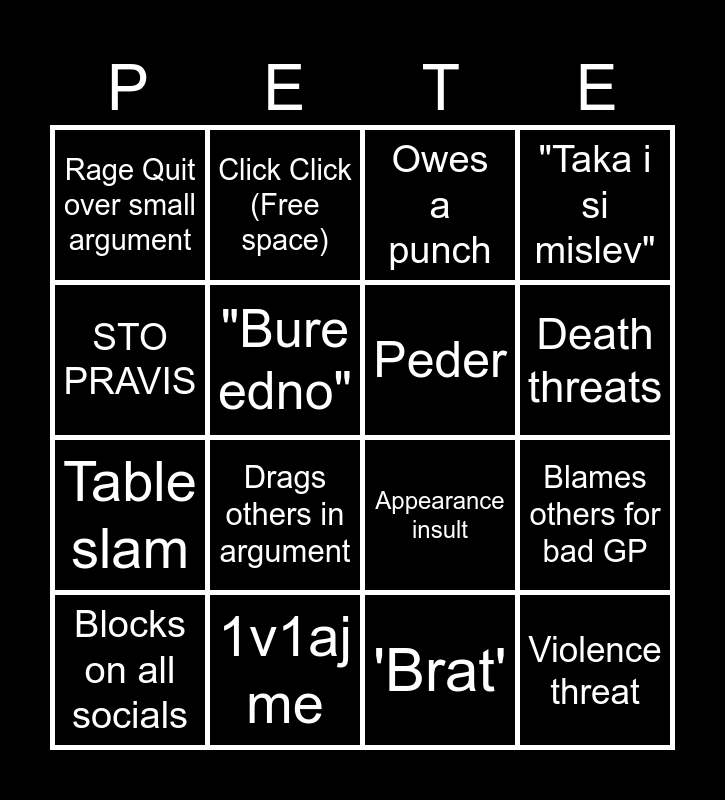 This bingo card has 19 words: Appearance insult, Family stuff, Owes a punch, Violence threat, Blames others for bad GP, STO PRAVIS, 'Brat', Rage Quit over small argument, Click Click (Free space), Table slam, Drags others in argument, "Bure edno", Peder, 1v1aj me, Blocks on all socials, Genital insults, "Taka i si mislev", Death threats and Random Sounds.