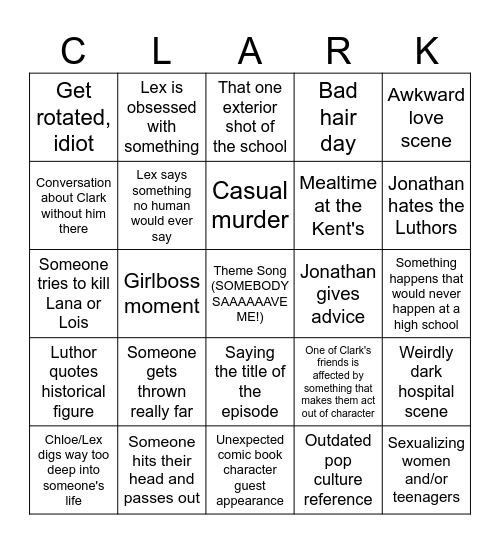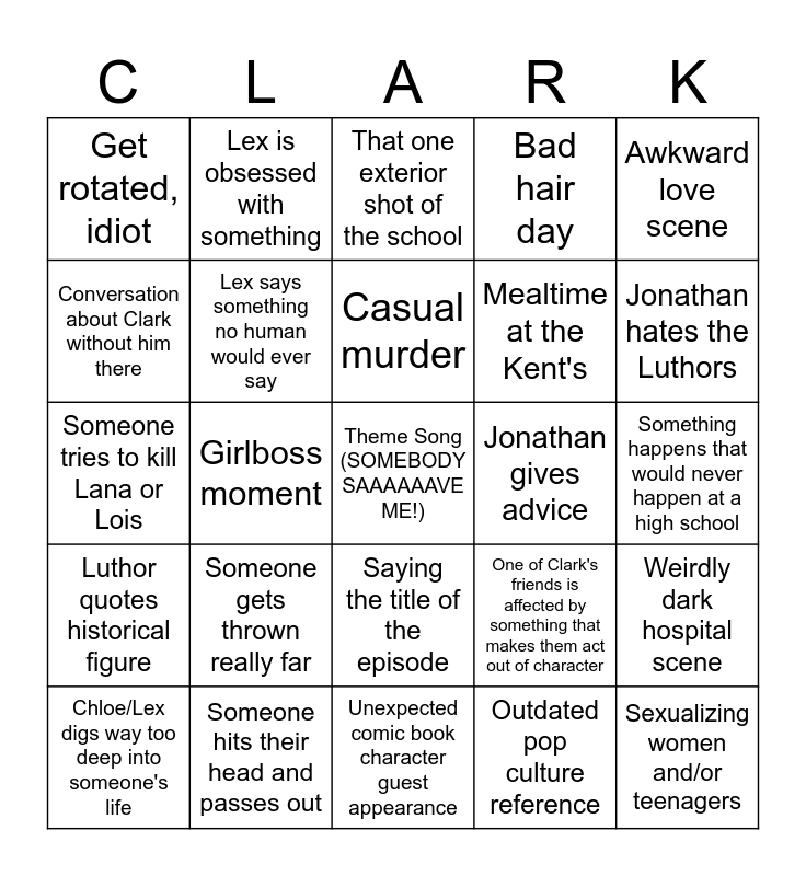 This bingo card has 1 images, a free space and 59 words: Clark? (Looks around) Clark?, Someone hits their head and passes out, Dysfunctional parents and their consequences, Luthor quotes historical figure, Outdated pop culture reference, Obviously lying, Lex says something no human would ever say, Martha is the only reason anything gets done, Mealtime at the Kent's, Chloe still hates herself for rejecting Clark, Bad hair day, Slow-Mo superspeed scene, Conversation about Clark without him there, Plot hole, Villain doesn't get resolved, Get rotated, idiot, Sexualizing women and/or teenagers, Awkward love scene, Tom Welling's lack of acting, Casual murder, Jonathan gives advice, That one exterior shot of the school, Chloe/Lex digs way too deep into someone's life, Weirdly dark hospital scene, Obvious Superman foreshadowing, Lex roasts Lionel, Boring relationship drama, Villain's power makes literally no sense, Jonathan hates the Luthors, Chloe: Oh, let me call my contact at the..., Chloe is weirdly smart, Jason makes a bad joke, Overdramatic mood lighting, "The Caves", Lex is obsessed with something, History lesson!, Villain is annoying, Girlboss moment, Someone tries to kill Lex or Chloe, Someone tries to kill Lana or Lois, Painfully bad CGI, Someone gets thrown really far, Something happens that would never happen at a high school, Downplaying serious matters, Villain looks like a school shooter, That one exterior shot of Lex's castle, Lois is sarcastic in a dangerous situation, Convenient use of Kryptonite, Saying the title of the episode, Unexpected comic book character guest appearance, Unexpected cameo from a well-known actor, Villain is resolved in their first fight with Clark, Weirdly niche comic book reference, Character learns Clark is an alien but forgets by the end of the episode, Clark is affected by something that makes him act out of character, One of Clark's friends is affected by something that makes them act out of character, Obvious "Lex being a villain" foreshadowing, Clark stares off into the distance while angsty music plays and Jor-El sucks.