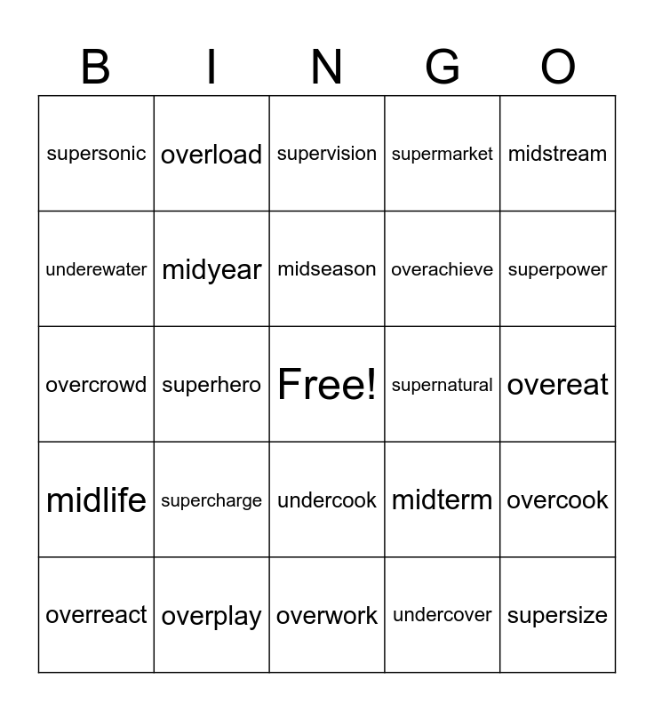 This bingo card has a free space and 36 words: midday, midnight, midweek, midyear, midterm, midlife, midseason, midair, midstream, midsummer, superhero, supermarket, superstar, supernatural, superpower, supersonic, superhuman, supercharge, supersize, supervision, overeat, overcook, overplay, overreact, overwork, overload, overcrowd, oversleep, overachieve, underewater, underweight, undergrowth, undercover, undercook, underestimate and underachieve.