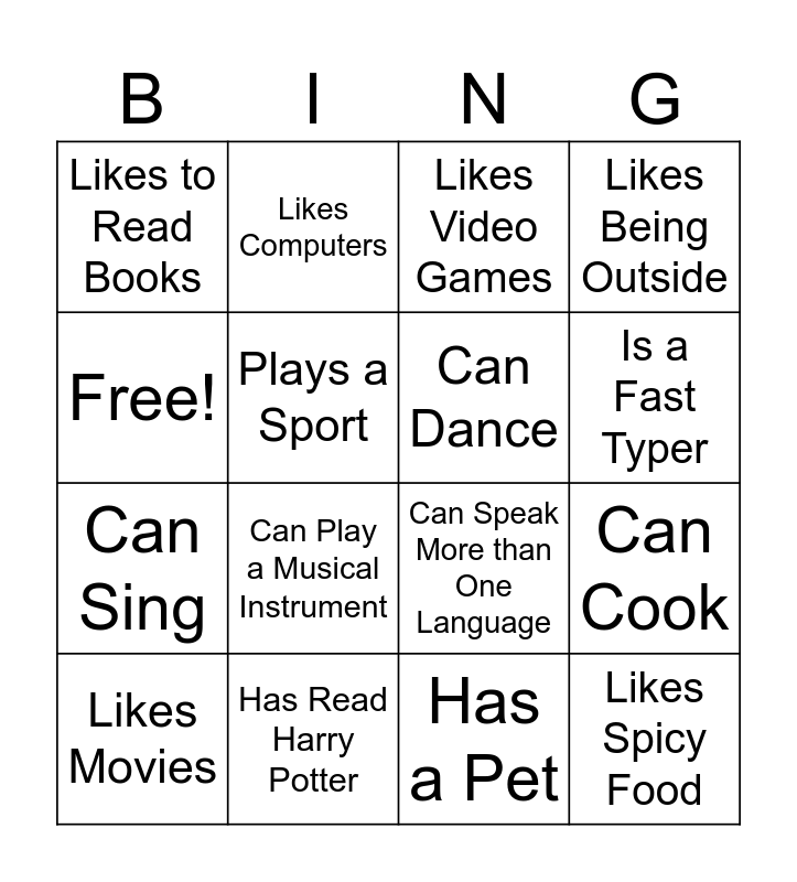 This bingo card has 16 words: Has Read Harry Potter, Can Cook, Likes Video Games, Likes to Read Books, Can Sing, Likes Computers, Can Speak More than One Language, Has a Pet, Free!, Plays a Sport, Likes Movies, Likes Being Outside, Can Play a Musical Instrument, Is a Fast Typer, Can Dance and Likes Spicy Food.