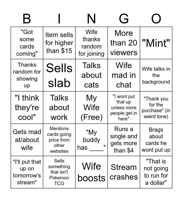 This bingo card has a free space and 53 words: My wife organized my cards, "That is not going to run for a dollar", Loses track of orders, Stream crashes, Mentions cards going price from other websites, "If you want anything specific, just ask.", Item sells for higher than $15, Self deprecating comment about stream, Thanks random for showing up, "DM me after stream and we can talk about it", Sells slab, Rips pack, Brags about cards he wont put up, Runs a single and gets more than $4, Runs a card that is on display (background), "I'll put that up on tomorrow's stream", Talks about cats, "I wont put that up unless more people get in here", Gets mad at someone in chat, "Mint", Talks about work, Talks about other Whatnot streams success, Wife mad in chat, "Got some cards coming", "I'll try and get (that card) for you", Sells something that isn't Pokemon TCG, Goes 5 minutes without putting up a new auction, Wife wins giveaway, Camera falls over, Wife talks in the background, Refunds auction, Tells one of us "You can't say that", Mentions Twitter/X, Cat walks on workspace, Pauses stream, Technical issue, More than 20 viewers, Wife boosts, Wife thanks random for joining, Mentions "Price checking" (Exact words), Asks wife to do something for him, Pronounces something wrong, "Thank you for the purchase" (in weird tone), Narrates a bidding war, Feels bad for something being in bad condition, "My buddy has ____", Someone gets banned, He uses one of our actual names, "I think they're cool", Gets mad at/about wife, Puts something from the background up to the camera, Tells random personal story and Buddy.