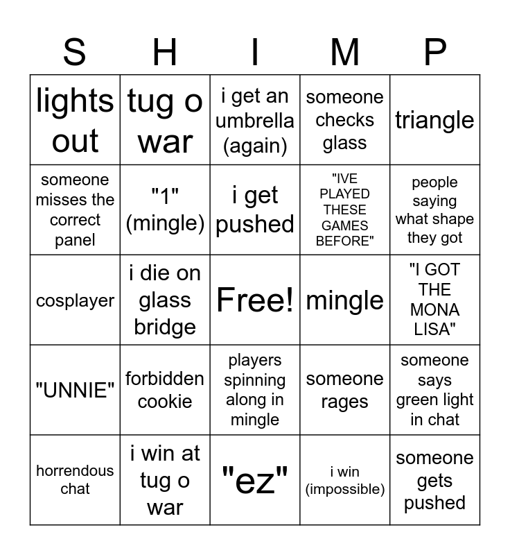 This bingo card has a free space and 24 words: forbidden cookie, i win at tug o war, i get pushed, horrendous chat, triangle, lights out, someone misses the correct panel, tug o war, mingle, players spinning along in mingle, "IVE PLAYED THESE GAMES BEFORE", cosplayer, someone rages, someone says green light in chat, "1" (mingle), i win (impossible), "I GOT THE MONA LISA", i get an umbrella (again), people saying what shape they got, i die on glass bridge, someone gets pushed, "UNNIE", someone checks glass and "ez".