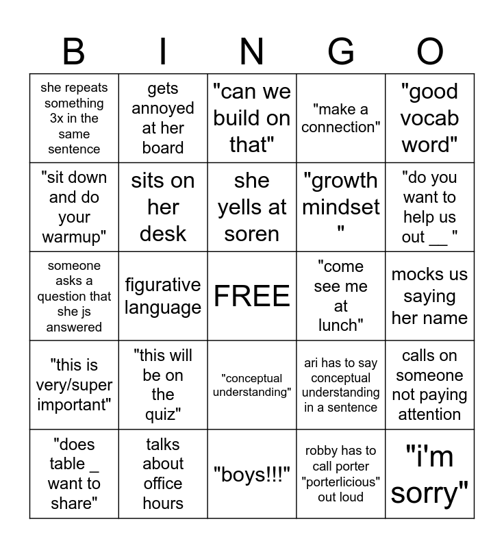 This bingo card has a free space and 32 words: robby has to call porter "porterlicious" out loud, paper airplanes, figurative language, pushes up glasses, "this is very/super important", sits on her desk, "good vocab word", calls on someone not paying attention, gets annoyed at her board, "ask three before me", she yells at soren, "can we build on that", thomas says "disenfranchisement" while asking a question, "table _ was having a great conversation", "come see me at lunch", ian s has to ask a question with his finger up, "does table _ want to share", someone asks a question that she js answered, "conceptual understanding", "this will be on the quiz", ari has to say conceptual understanding in a sentence, claps/snaps, mocks us saying her name, talks about office hours, "i'm sorry", "make a connection", "growth mindset ", "sit down and do your warmup", she repeats something 3x in the same sentence, "boys!!!", talks about her brain not working and "do you want to help us out __ ".