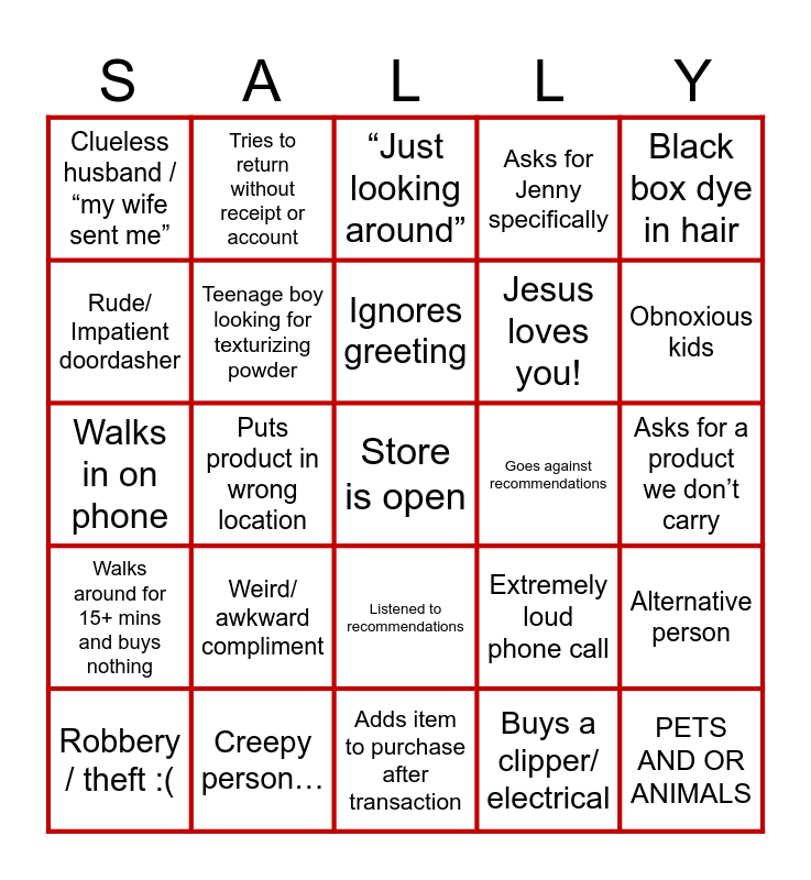 This bingo card has a free space and 24 words: Weird/ awkward compliment, Creepy person…, Ignores greeting, Robbery / theft :(, Black box dye in hair, Clueless husband / “my wife sent me”, Rude/ Impatient doordasher, Tries to return without receipt or account, Goes against recommendations, Listened to recommendations, Jesus loves you!, Walks in on phone, Extremely loud phone call, Alternative person, Teenage boy looking for texturizing powder, Buys a clipper/ electrical, Asks for a product we don’t carry, “Just looking around”, Obnoxious kids, Puts product in wrong location, PETS AND OR ANIMALS, Walks around for 15+ mins and buys nothing, Asks for Jenny specifically and Adds item to purchase after transaction.