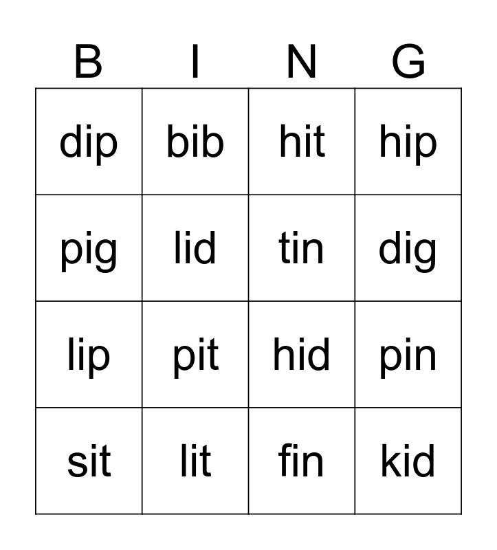 This bingo card has 16 words: lit, pin, hit, dip, lip, bib, hid, fin, pig, lid, sit, hip, pit, dig, tin and kid.
