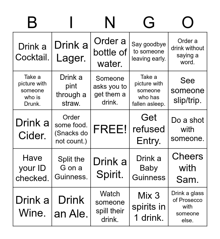 This bingo card has a free space and 24 words: Split the G on a Guinness., Drink an Ale., Someone asks you to get them a drink., Drink a Wine., Order a drink without saying a word., Drink a Cocktail., Take a picture with someone who is Drunk., Drink a Lager., Get refused Entry., Drink a Spirit., Take a picture with someone who has fallen asleep., Drink a Cider., Drink a Baby Guinness, Cheers with Sam., Drink a pint through a straw., Mix 3 spirits in 1 drink., Do a shot with someone., Order a bottle of water., See someone slip/trip., Order some food. (Snacks do not count.), Drink a glass of Prosecco with someone else., Have your ID checked., Say goodbye to someone leaving early. and Watch someone spill their drink..