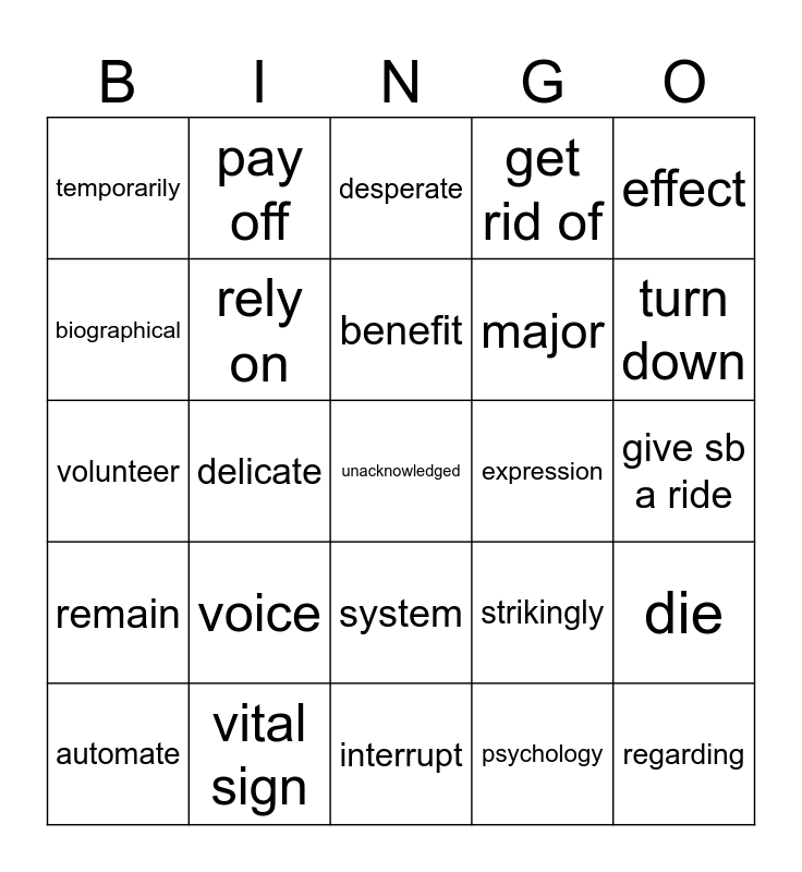 This bingo card has 74 words: overall, self-discipline, desperate, influencer, surgery, commitment, formation, opponent, automate, time-consuming, all-around, access, benefit, biographical, opportunity, delicate, regarding, turn down, challenge, volunteer, rely on, pay off, get rid of, take up, unacknowledged, extremely, power, break, ruin, hit, effect, disaster, hurricane, notify, emergency, psychology, shelter, collapsed, bleed, stabilize, interrupt, vital sign, ambulance, livelihood, capacity, temporarily, respond, voice, storm, in advance, be suitable for, get stuck in, give sb a ride, 第五周, factor, native, system, character, mother tongue, die, major, replace, remain, make-up, expression, feature, sizable, numerous, strikingly, be related to, be similar to, play an important role, medical care and rain cats and dogs.