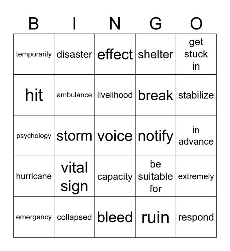 This bingo card has 28 words: extremely, power, break, ruin, hit, effect, disaster, hurricane, notify, emergency, psychology, shelter, collapsed, bleed, stabilize, interrupt, vital sign, ambulance, livelihood, capacity, temporarily, respond, voice, storm, in advance, be suitable for, get stuck in and give sb a ride.