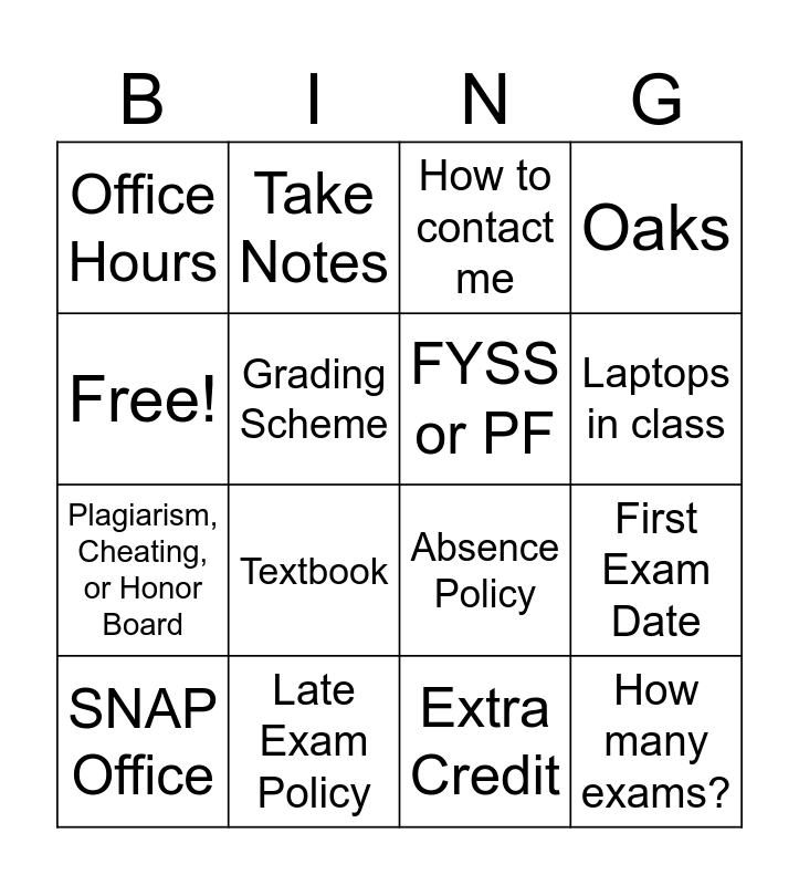 This bingo card has 16 words: Late Exam Policy, First Exam Date, How to contact me, Office Hours, Plagiarism, Cheating, or Honor Board, Take Notes, Absence Policy, Extra Credit, Free!, Grading Scheme, SNAP Office, Oaks, Textbook, Laptops in class, FYSS or PF and How many exams?.