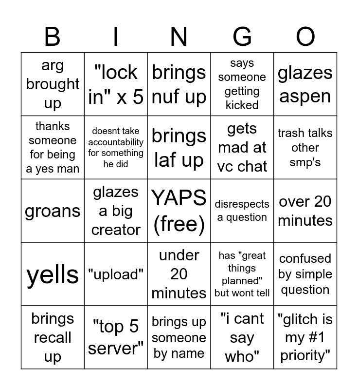 This bingo card has a free space and 24 words: "upload", "top 5 server", brings laf up, brings recall up, glazes aspen, arg brought up, thanks someone for being a yes man, "lock in" x 5, disrespects a question, under 20 minutes, gets mad at vc chat, groans, has "great things planned" but wont tell, confused by simple question, doesnt take accountability for something he did, "i cant say who", over 20 minutes, brings nuf up, trash talks other smp's, glazes a big creator, "glitch is my #1 priority", yells, says someone getting kicked and brings up someone by name.