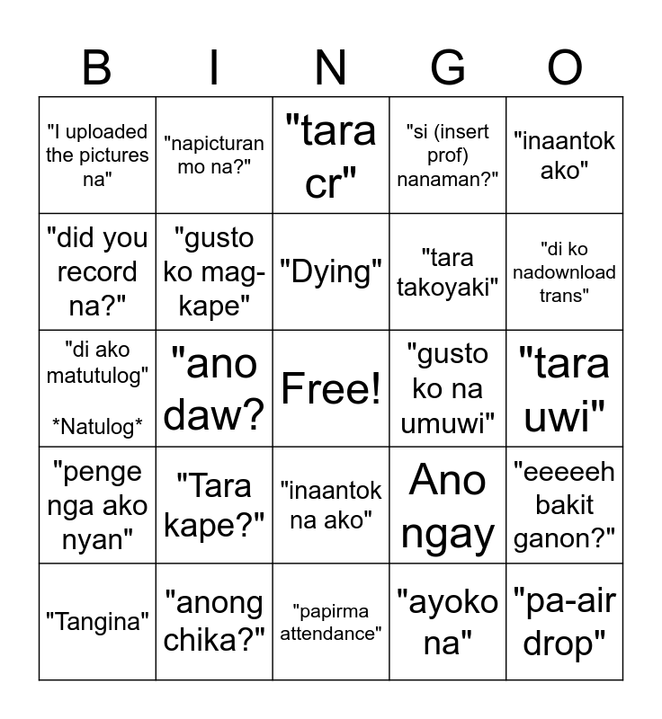 This bingo card has a free space and 24 words: "Tangina", "Tara kape?", "Dying", "ayoko na", "inaantok ako", "I uploaded the pictures na", "napicturan mo na?", "tara cr", "gusto ko na umuwi", "tara uwi", "di ako matutulog" *Natulog*, "gusto ko mag-kape", Ano ngay, "eeeeeh bakit ganon?", "did you record na?", "anong chika?", "papirma attendance", "si (insert prof) nanaman?", "di ko nadownload trans", "penge nga ako nyan", "ano daw?, "inaantok na ako", "tara takoyaki" and "pa-air drop".