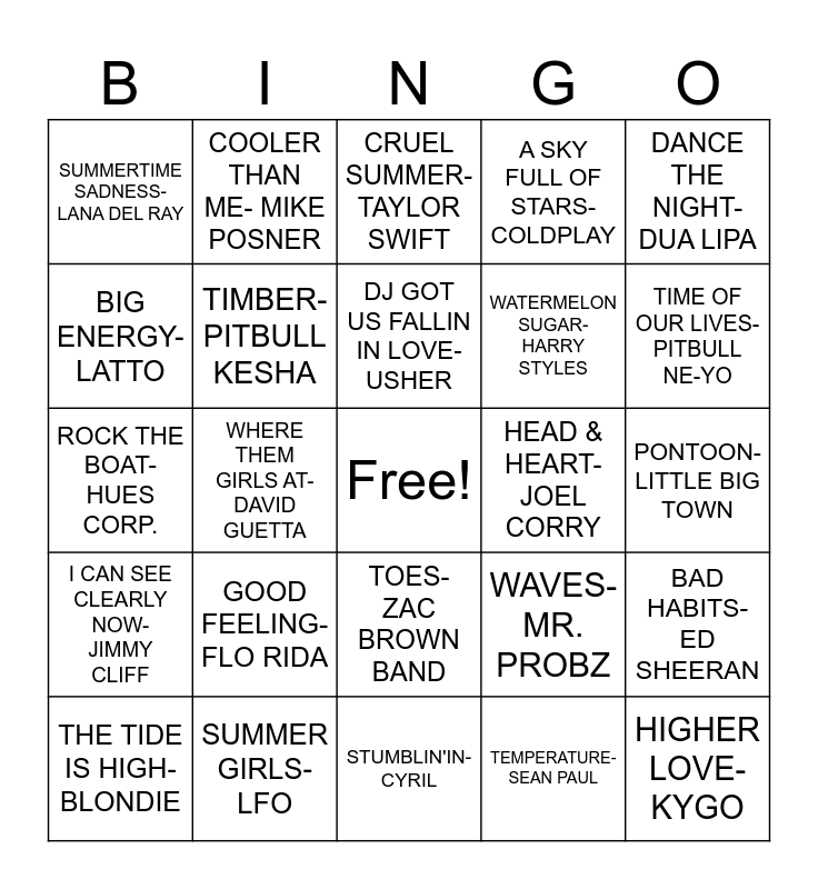 This bingo card has a free space and 50 words: I HAD SOME HELP- MORGAN WALLEN, HIGHER LOVE- KYGO, ESPRESSO- SABRINA CARPENTER, STUMBLIN'IN- CYRIL, GOOD FEELING- FLO RIDA, WAKE ME UP- AVICII, COOLER THAN ME- MIKE POSNER, SLIDE- CALVIN HARRIS, BIG ENERGY- LATTO, I AIN'T WORRIED- ONE REPUBLIC, TIMBER- PITBULL KESHA, A SKY FULL OF STARS- COLDPLAY, BAD HABITS- ED SHEERAN, WAVES- MR. PROBZ, SUMMER- CALVIN HARRIS, WE FOUND LOVE- RIHANNA, DJ GOT US FALLIN IN LOVE- USHER, HEAD & HEART- JOEL CORRY, LEVITATING- DUA LIPA, DANCE THE NIGHT- DUA LIPA, WHERE THEM GIRLS AT- DAVID GUETTA, TEMPERATURE- SEAN PAUL, SUMMERTIME SADNESS- LANA DEL RAY, WATERMELON SUGAR- HARRY STYLES, DESPACITO- LUIS FONSI DADDY YANKEE, I LIKE IT- CARDI B, TIME OF OUR LIVES- PITBULL NE-YO, A BAR SONG- SHABOOZEY, CRUEL SUMMER- TAYLOR SWIFT, TOES- ZAC BROWN BAND, MARGARITAVILLE- JIMMY BUFFETT, SUMMER NIGHTS- GREASE, ISLAND IN THE SUN-WEEZER, SURFIN USA- THE BEACH BOYS, SUMMER GIRLS- LFO, COOL FOR THE SUMMER- DEMI LOVATO, ONE LOVE- BOB MARLEY, SOAK UP THE SUN- SHERYL CROW, 7 SUMMERS-MORGAN WALLEN, PONTOON- LITTLE BIG TOWN, JUICE- LIZZO, WALKIN ON THE SUN- SMASH MOUTH, STEAL MY SUNSHINE- LEN, IN THE SUMMERTIME- MUNGO JERRY, THE TIDE IS HIGH-BLONDIE, ROCK THE BOAT- HUES CORP., JAMMING-BOB MARLEY, UNDER THE BOARDWALK- THE DRIFTERS, I CAN SEE CLEARLY NOW- JIMMY CLIFF and SUMMER IN THE CITY- THE LOVIN SPOONFUL.