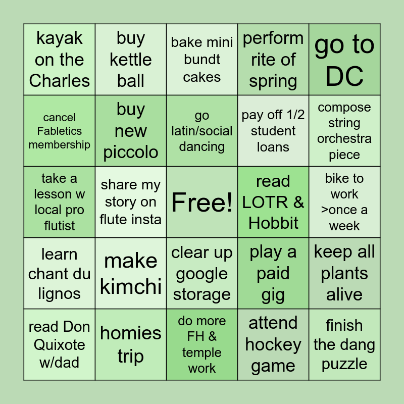 This bingo card has a free space and 24 words: make kimchi, homies trip, go latin/social dancing, read Don Quixote w/dad, go to DC, kayak on the Charles, cancel Fabletics membership, buy kettle ball, read LOTR & Hobbit, clear up google storage, pay off 1/2 student loans, take a lesson w local pro flutist, play a paid gig, keep all plants alive, buy new piccolo, attend hockey game, bike to work >once a week, bake mini bundt cakes, compose string orchestra piece, share my story on flute insta, finish the dang puzzle, learn chant du lignos, perform rite of spring and do more FH & temple work.
