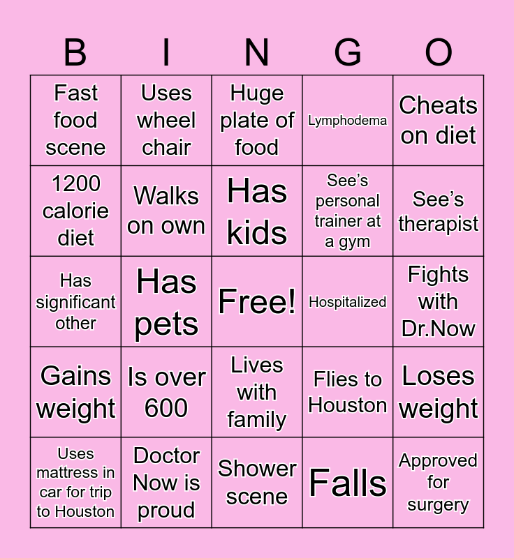 This bingo card has a free space and 24 words: Is over 600, Doctor Now is proud, Has kids, Uses mattress in car for trip to Houston, Cheats on diet, Fast food scene, 1200 calorie diet, Uses wheel chair, Hospitalized, Lives with family, See’s personal trainer at a gym, Has significant other, Flies to Houston, Loses weight, Walks on own, Falls, Fights with Dr.Now, Huge plate of food, See’s therapist, Has pets, Approved for surgery, Gains weight, Lymphodema and Shower scene.