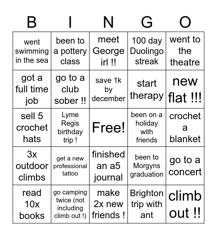 This bingo card has a free space and 24 words: get a new professional tattoo, go camping twice (not including climb out !), save 1k by december, read 10x books, went to the theatre, went swimming in the sea, got a full time job, been to a pottery class, been on a holiday with friends, finished an a5 journal, start therapy, sell 5 crochet hats, been to Morgyns graduation, go to a concert, go to a club sober !!, Brighton trip with ant, crochet a blanket, meet George irl !!, new flat !!!, Lyme Regis birthday trip !, climb out !!, 3x outdoor climbs, 100 day Duolingo streak and make 2x new friends !.