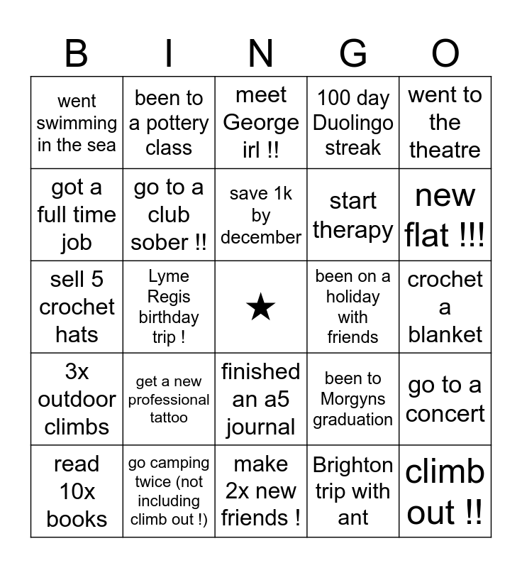 This bingo card has a free space and 24 words: get a new professional tattoo, go camping twice (not including climb out !), save 1k by december, read 10x books, went to the theatre, went swimming in the sea, got a full time job, been to a pottery class, been on a holiday with friends, finished an a5 journal, start therapy, sell 5 crochet hats, been to Morgyns graduation, go to a concert, go to a club sober !!, Brighton trip with ant, crochet a blanket, meet George irl !!, new flat !!!, Lyme Regis birthday trip !, climb out !!, 3x outdoor climbs, 100 day Duolingo streak and make 2x new friends !.