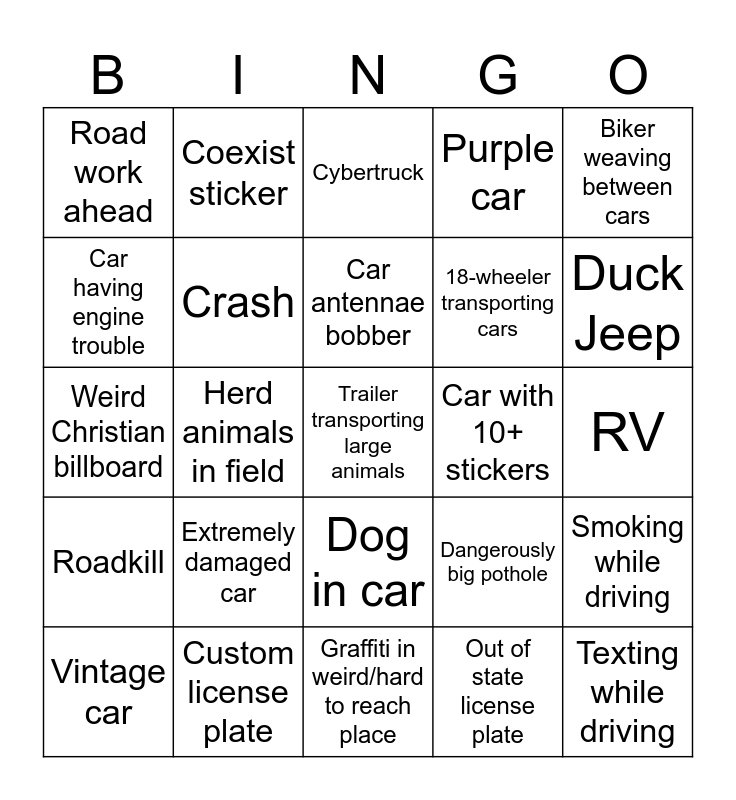 This bingo card has 30 words: Custom license plate, Cop pulled someone over, Herd animals in field, Oversized load transport, Road work ahead, Cybertruck, Crash, Dog in car, Car with 10+ stickers, Graffiti in weird/hard to reach place, RV, Trailer transporting large animals, Out of state license plate, Texting while driving, Duck Jeep, National/ State Park signs, Dangerously big pothole, Roadkill, Extremely damaged car, Biker weaving between cars, Weird Christian billboard, Emergency vehicles en route, Coexist sticker, 18-wheeler transporting cars, Car having engine trouble, Purple car, Smoking while driving, Vintage car, Car antennae bobber and Stick figure family.