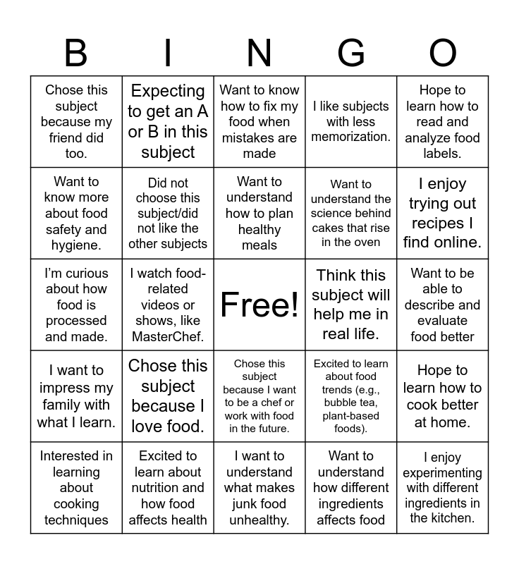 This bingo card has a free space and 24 words: Chose this subject because I love food., Excited to learn about nutrition and how food affects health, Want to understand how to plan healthy meals, Interested in learning about cooking techniques, Hope to learn how to read and analyze food labels., Chose this subject because my friend did too., Want to know more about food safety and hygiene., Expecting to get an A or B in this subject, Think this subject will help me in real life., Chose this subject because I want to be a chef or work with food in the future., Want to understand the science behind cakes that rise in the oven, I’m curious about how food is processed and made., Excited to learn about food trends (e.g., bubble tea, plant-based foods)., Hope to learn how to cook better at home., Did not choose this subject/did not like the other subjects, Want to understand how different ingredients affects food, Want to be able to describe and evaluate food better, Want to know how to fix my food when mistakes are made, I enjoy trying out recipes I find online., I watch food-related videos or shows, like MasterChef., I enjoy experimenting with different ingredients in the kitchen., I want to impress my family with what I learn., I like subjects with less memorization. and I want to understand what makes junk food unhealthy..