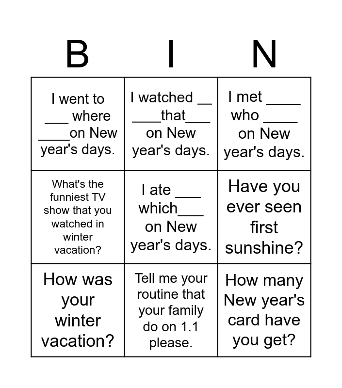 This bingo card has 9 words: How was your winter vacation?, I ate ___ which___ on New year's days., I met ____ who ____ on New year's days., I went to ___ where ____on New year's days., I watched ___that___ on New year's days., Have you ever seen first sunshine?, What's the funniest TV show that you watched in winter vacation?, Tell me your routine that your family do on 1.1 please. and How many New year's card have you get?.