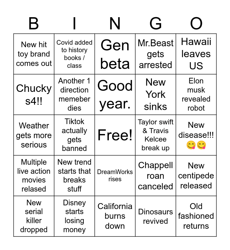 This bingo card has a free space and 24 words: New trend starts that breaks stuff, Disney starts losing money, Good year., New serial killer dropped, Hawaii leaves US, New hit toy brand comes out, Chucky s4!!, Covid added to history books / class, Taylor swift & Travis Kelcee break up, DreamWorks rises, New York sinks, Weather gets more serious, Chappell roan canceled, New centipede released, Another 1 direction memeber dies, Dinosaurs revived, New disease!!! 😋😋, Gen beta, Elon musk revealed robot, Tiktok actually gets banned, Old fashioned returns, Multiple live action movies relased, Mr.Beast gets arrested and California burns down.