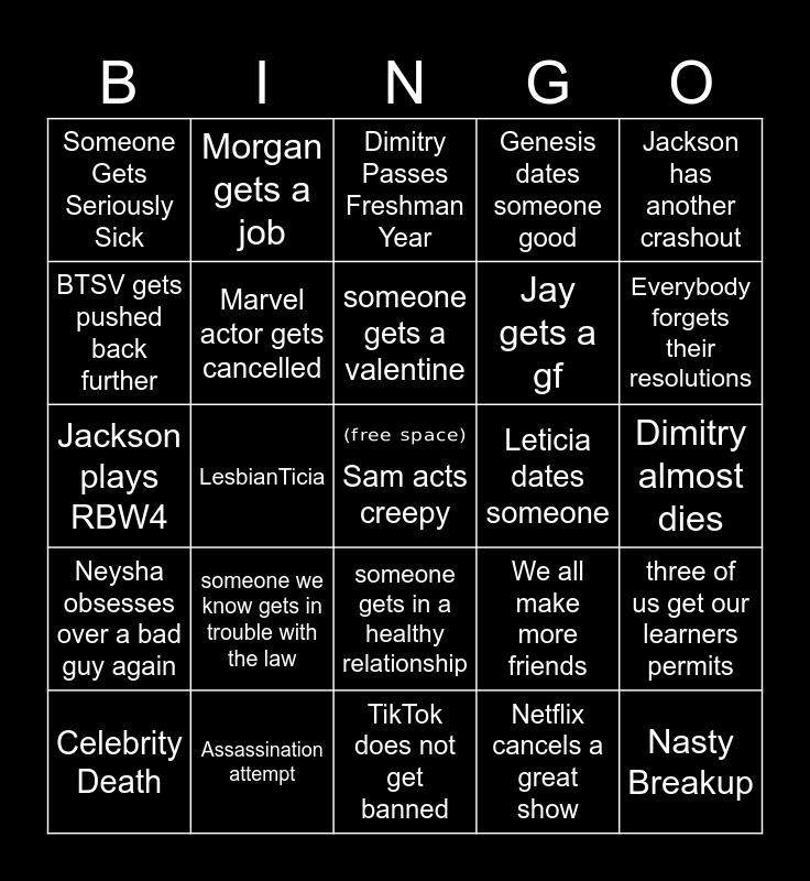 This bingo card has a free space and 29 words: Celebrity Death, Somebody dates a Jackson, LesbianTicia, We all go hang out and nobody cancels, Someone Gets Seriously Sick, Dimitry Passes Freshman Year, Marvel actor gets cancelled, someone we know gets in trouble with the law, Leticia dates someone, Assassination attempt, Dimitry almost dies, Nasty Breakup, TikTok does not get banned, Netflix cancels a great show, Everybody forgets their resolutions, we stop using brainrot, someone gets in a healthy relationship, Neysha obsesses over a bad guy again, Jackson has another crashout, Jackson plays RBW4, We all make more friends, Dimitry learns Spanish, Jay gets a gf, BTSV gets pushed back further, Genesis dates someone good, Morgan gets a job, three of us get our learners permits, someone gets a valentine and Lebron wins the championship.