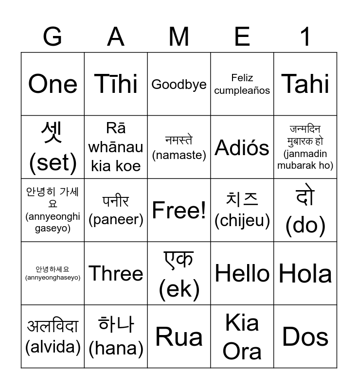 This bingo card has a free space and 35 words: Haere rā, 생일 축하합니다 (saengil chukhahamnida), Tres, Rā whānau kia koe, एक (ek), Feliz cumpleaños, 셋 (set), Happy Birthday, नमस्ते (namaste), Uno, 안녕히 가세요 (annyeonghi gaseyo), Tahi, तीन (teen), Queso, One, 치즈 (chijeu), Kia Ora, पनीर (paneer), 안녕하세요 (annyeonghaseyo), Dos, Hello, अलविदा (alvida), Hola, 하나 (hana), Goodbye, जन्मदिन मुबारक हो (janmadin mubarak ho), 둘 (dul), Toru, Adiós, दो (do), Cheese, Rua, Three, Tīhi and Two.