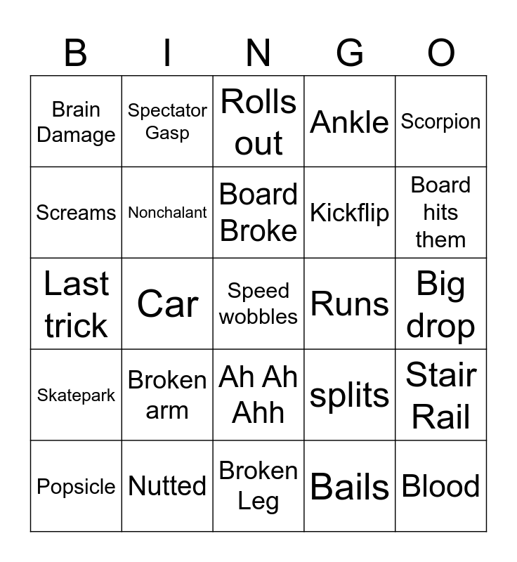 This bingo card has 25 words: Broken arm, Broken Leg, Board Broke, Popsicle, Scorpion, Brain Damage, Screams, Spectator Gasp, Runs, Ah Ah Ahh, Kickflip, Last trick, splits, Stair Rail, Nonchalant, Blood, Big drop, Rolls out, Board hits them, Car, Speed wobbles, Nutted, Skatepark, Ankle and Bails.