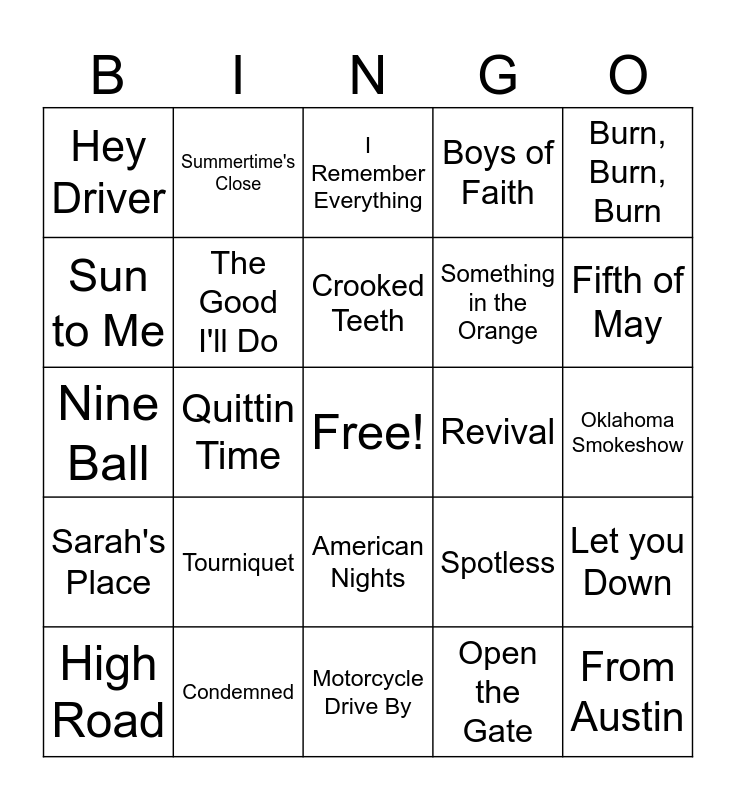 This bingo card has a free space and 29 words: High Road, 28, Quittin Time, Pink Skies, Hey Driver, I Remember Everything, The Good I'll Do, Tourniquet, Revival, Condemned, Oklahoma Smokeshow, From Austin, Motorcycle Drive By, Open the Gate, Fifth of May, Bass Boat, American Nights, Sarah's Place, Burn, Burn, Burn, Nine Ball, Spotless, Heading South, Something in the Orange, Sun to Me, Boys of Faith, Summertime's Close, Let you Down, Crooked Teeth and November Air.