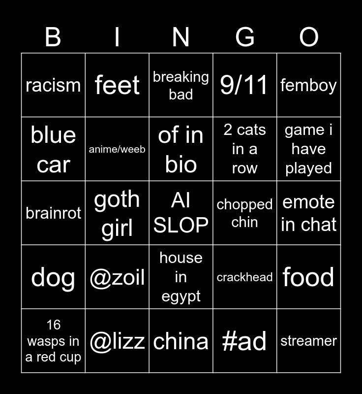 This bingo card has a free space and 24 words: @zoil, @lizz, of in bio, 16 wasps in a red cup, femboy, racism, blue car, feet, chopped chin, house in egypt, 2 cats in a row, brainrot, crackhead, food, anime/weeb, #ad, emote in chat, breaking bad, game i have played, goth girl, streamer, dog, 9/11 and china.