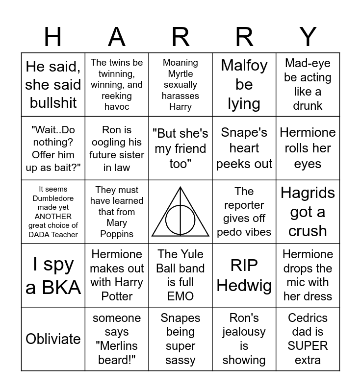 This bingo card has a free space and 29 words: Obliviate, Team Edward, They must have learned that from Mary Poppins, HDYPYNITGOF, He said, she said bullshit, Moaning Myrtle sexually harasses Harry, Ron is oogling his future sister in law, Hermione makes out with Harry Potter, The reporter gives off pedo vibes, someone says "Merlins beard!", Hagrids got a crush, Cedrics dad is SUPER extra, Snapes being super sassy, Ron's jealousy is showing, Hermione rolls her eyes, Fleur's got a bad case of "mean girl", The Yule Ball band is full EMO, I spy a BKA, Mad-eye be acting like a drunk, It seems Dumbledore made yet ANOTHER great choice of DADA Teacher, RIP Hedwig, Ferit, Snape's heart peeks out, "Wait..Do nothing? Offer him up as bait?", Malfoy be lying, The twins be twinning, winning, and reeking havoc, Hermione drops the mic with her dress, "But she's my friend too" and "Priori Incantatem".