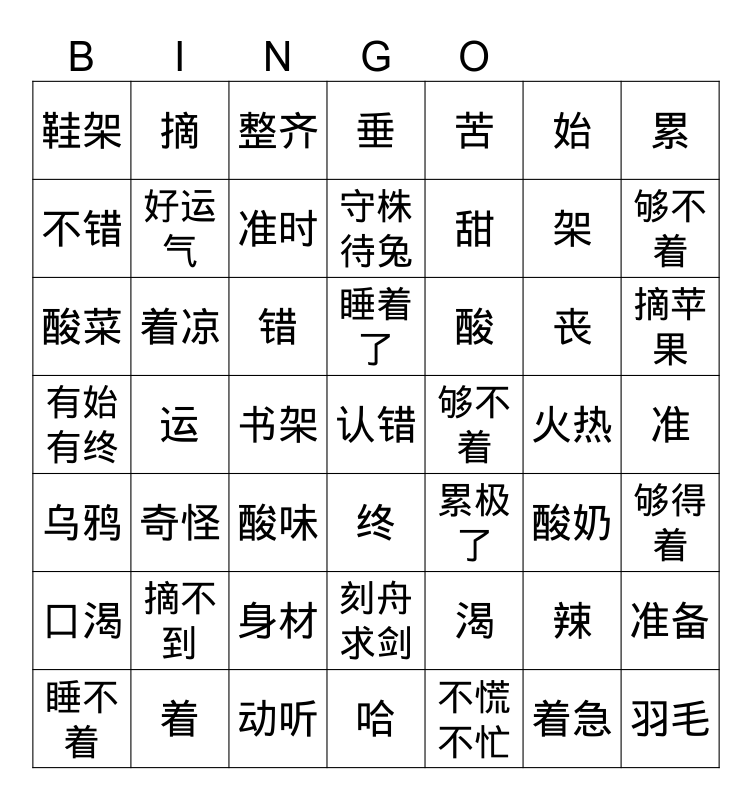 This bingo card has a free space and 48 words: 渴, 架, 哈, 运, 错, 准, 摘, 着, 始, 终, 累, 垂, 丧, 酸, 口渴, 火热, 不错, 够不着, 辣, 苦, 甜, 书架, 鞋架, 好运气, 准备, 准时, 摘苹果, 睡不着, 睡着了, 着凉, 着急, 够不着, 够得着, 摘不到, 有始有终, 累极了, 酸奶, 酸菜, 酸味, 身材, 乌鸦, 羽毛, 整齐, 动听, 守株待兔, 刻舟 求剑, 奇怪 and 不慌不忙.