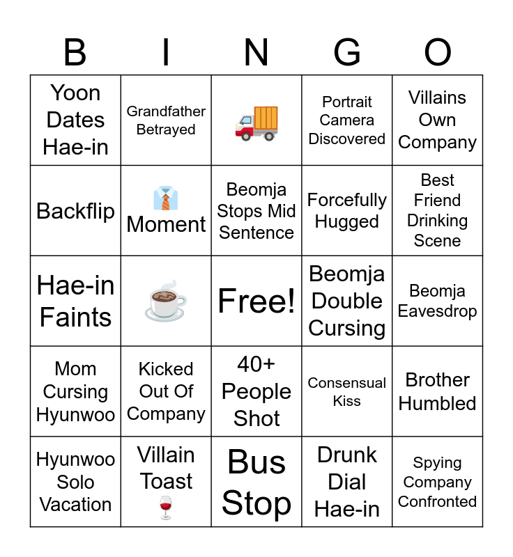This bingo card has a free space and 24 words: Kicked Out Of Company, Villain Toast 🍷, Beomja Stops Mid Sentence, Hyunwoo Solo Vacation, Villains Own Company, Yoon Dates Hae-in, Backflip, Grandfather Betrayed, Beomja Double Cursing, 40+ People Shot, Forcefully Hugged, Hae-in Faints, Consensual Kiss, Brother Humbled, 👔 Moment, Drunk Dial Hae-in, Beomja Eavesdrop, 🚚, Best Friend Drinking Scene, ☕, Spying Company Confronted, Mom Cursing Hyunwoo, Portrait Camera Discovered and Bus Stop.