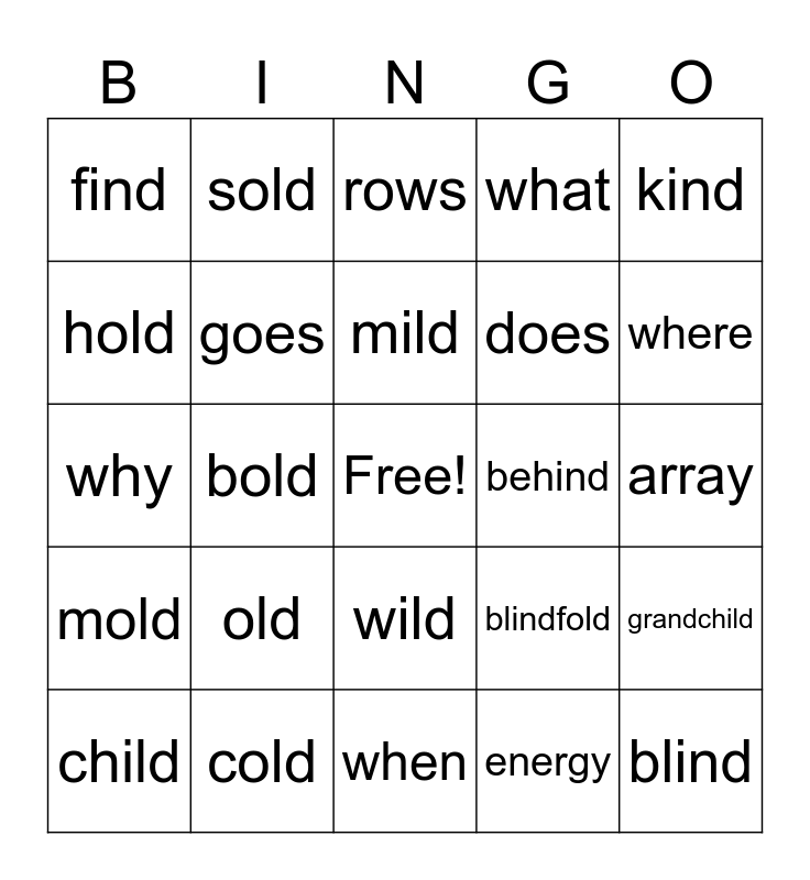 This bingo card has a free space and 24 words: old, cold, mild, child, kind, find, hold, sold, behind, wild, does, why, blindfold, grandchild, goes, energy, array, rows, where, bold, blind, mold, what and when.