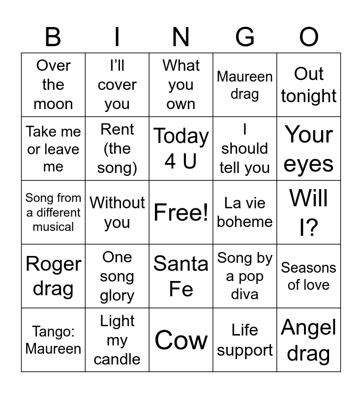 This bingo card has a free space and 24 words: One song glory, Light my candle, Today 4 U, Tango: Maureen, Out tonight, Over the moon, Take me or leave me, I’ll cover you, La vie boheme, Santa Fe, I should tell you, Song from a different musical, Song by a pop diva, Seasons of love, Rent (the song), Life support, Will I?, What you own, Your eyes, Without you, Angel drag, Roger drag, Maureen drag and Cow.