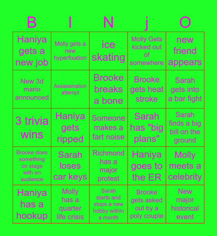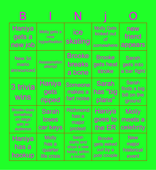 This bingo card has a free space and 24 words: Sarah loses car keys, Molly has a quarter life crisis, Brooke breaks a bone, Haniya has a hookup, new friend appears, Haniya gets a new job, New 3d mario announced, Molly gets a new hyperfixation, Sarah has "big plans", Richmond has a major protest, Brooke gets heat stroke, 3 trivia wins, Haniya goes to the ER, Molly meets a celebrity, Assassination attempt, Brooke gets asked out by a poly couple, Sarah finds a big bill on the ground, ice skating, Sarah gets into a bar fight, Haniya gets ripped, New major historical event, Brooke does something on stage with an audience, Molly Gets kicked out of somewhere and Sarah starts and stops a new hobby within a month.