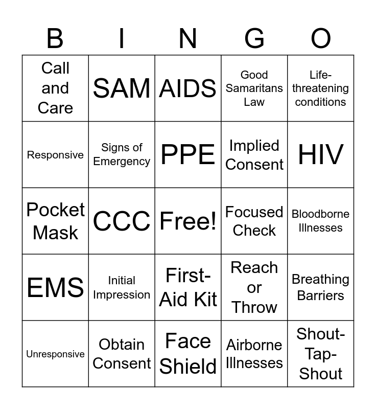 This bingo card has a free space and 24 words: Initial Impression, Obtain Consent, PPE, Unresponsive, Life-threatening conditions, Call and Care, Responsive, SAM, Focused Check, First-Aid Kit, Implied Consent, Pocket Mask, Reach or Throw, Breathing Barriers, Signs of Emergency, Airborne Illnesses, Bloodborne Illnesses, AIDS, HIV, CCC, Shout-Tap-Shout, EMS, Good Samaritans Law and Face Shield.