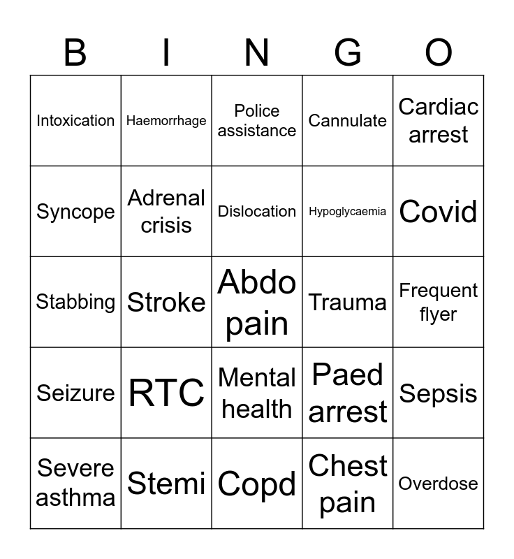 This bingo card has a free space and 24 words: RTC, Stemi, Dislocation, Severe asthma, Cardiac arrest, Intoxication, Syncope, Haemorrhage, Trauma, Mental health, Hypoglycaemia, Stabbing, Paed arrest, Sepsis, Adrenal crisis, Chest pain, Frequent flyer, Police assistance, Covid, Stroke, Overdose, Seizure, Cannulate and Copd.