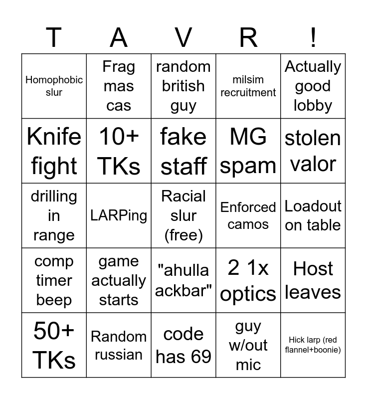 This bingo card has a free space and 57 words: AKTK enabled, 50+ TKs, music spam, Homophobic slur, code has 69, phallic object on board, 10+ TKs, Obvious child, MG spam, way too long briefing, milsim recruitment, random kick, Admitted underage, phallic plan, immediate death, brainrot, Actually good lobby, LARPing, Height glitcher, Hick larp (red flannel+boonie), Enforced camos, Child criticizing loadout, 2 1x optics, random british guy, screaming, fake staff, rank in name, Qualified, stolen valor, good whiteboard art, marker scribbles, Shotgun, non-night modifier enabled, Night, Loadout on table, Knife fight, random stim, drilling in range, "drilling" in range, comp timer beep, Frag mas cas, "ahulla ackbar", AI cosplay, smoke/flash spam, "I'll be the sniper", SVD CQB, game actually starts, Random russian, random "russian", older guy who just wants to play, unironic use of "CAG", guy w/out mic, "talk right now", constant flagging, taken hostage, Host leaves and CQB "pro".