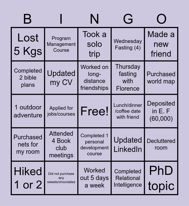 This bingo card has a free space and 24 words: Hiked 1 or 2, Attended 4 Book club meetings, Worked on long-distance friendships, Completed Relational Intelligence, Made a new friend, Lost 5 Kgs, Program Management Course, Took a solo trip, Lunch/dinner /coffee date with friend, Deposited in E. F (60,000), 1 outdoor adventure, Updated my CV, Updated LinkedIn, Decluttered room, Completed 2 bible plans, Did not purchase any sweets/chocolates, Worked out 5 days a week, Wednesday Fasting (4), Purchased world map, Purchased nets for my room, Applied for jobs/courses, Completed 1 personal development course, Thursday fasting with Florence and PhD topic.