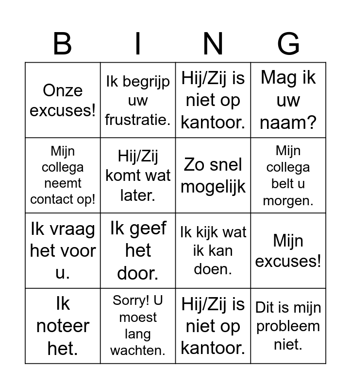 This bingo card has 16 words: Sorry! U moest lang wachten., Mijn excuses!, Hij/Zij is niet op kantoor., Onze excuses!, Ik vraag het voor u., Ik begrijp uw frustratie., Ik kijk wat ik kan doen., Hij/Zij is niet op kantoor., Mijn collega neemt contact op!, Hij/Zij komt wat later., Ik noteer het., Mag ik uw naam?, Ik geef het door., Mijn collega belt u morgen., Zo snel mogelijk and Dit is mijn probleem niet..