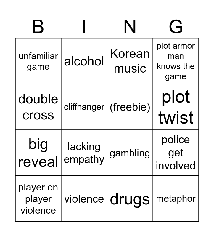 This bingo card has 16 words: player on player violence, violence, Korean music, plot armor man knows the game, double cross, alcohol, gambling, police get involved, unfamiliar game, cliffhanger, drugs, plot twist, big reveal, lacking empathy, (freebie) and metaphor.