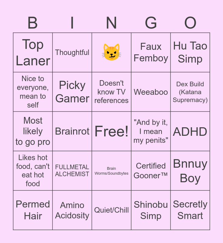This bingo card has a free space and 24 words: FULLMETAL ALCHEMIST, Amino Acidosity, Doesn't know TV references, Permed Hair, Hu Tao Simp, Top Laner, Nice to everyone, mean to self, Thoughtful, "And by it, I mean my penits", Brain Worms/Soundbytes, Weeaboo, Most likely to go pro, Certified Gooner™, Bnnuy Boy, Picky Gamer, Shinobu Simp, ADHD, 😼, Dex Build (Katana Supremacy), Brainrot, Secretly Smart, Likes hot food, can't eat hot food, Faux Femboy and Quiet/Chill.