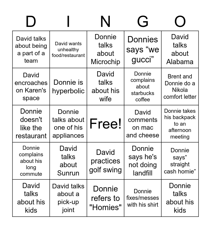 This bingo card has a free space and 24 words: David talks about Sunrun, David talks about a pick-up joint, David talks about his wife, David talks about his kids, David talks about Alabama, David talks about being a part of a team, David encroaches on Karen's space, David wants unhealthy food/restaurant, David comments on mac and cheese, David practices golf swing, Donnie complains about starbucks coffee, Donnie doesn't like the restaurant, Donnie says he's not doing landfill, Donnie says” straight cash homie”, Donnie is hyperbolic, Donnie fixes/messes with his shirt, Donnie takes his backpack to an afternoon meeting, Donnie talks about Microchip, Brent and Donnie do a Nikola comfort letter, Donnie talks about one of his appliances, Donnie talks about his kids, Donnie complains about his long commute, Donnies says “we gucci” and Donnie refers to "Homies".