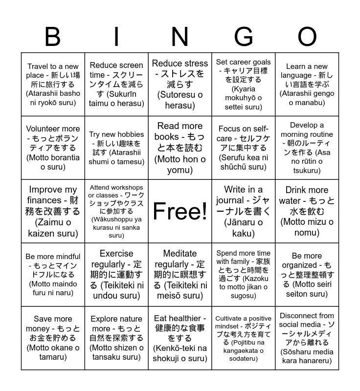 This bingo card has a free space and 25 words: Exercise regularly - 定期的に運動する (Teikiteki ni undou suru), Eat healthier - 健康的な食事をする (Kenkō-teki na shokuji o suru), Read more books - もっと本を読む (Motto hon o yomu), Save more money - もっとお金を貯める (Motto okane o tamaru), Learn a new language - 新しい言語を学ぶ (Atarashii gengo o manabu), Travel to a new place - 新しい場所に旅行する (Atarashii basho ni ryokō suru), Volunteer more - もっとボランティアをする (Motto borantia o suru), Reduce screen time - スクリーンタイムを減らす (Sukurīn taimu o herasu), Write in a journal - ジャーナルを書く (Jānaru o kaku), Meditate regularly - 定期的に瞑想する (Teikiteki ni meisō suru), Focus on self-care - セルフケアに集中する (Serufu kea ni shūchū suru), Improve my finances - 財務を改善する (Zaimu o kaizen suru), Spend more time with family - 家族ともっと時間を過ごす (Kazoku to motto jikan o sugosu), Be more organized - もっと整理整頓する (Motto seiri seiton suru), Try new hobbies - 新しい趣味を試す (Atarashii shumi o tamesu), Practice gratitude - 感謝の気持ちを実践する (Kansha no kimochi o jissen suru), Drink more water - もっと水を飲む (Motto mizu o nomu), Reduce stress - ストレスを減らす (Sutoresu o herasu), Develop a morning routine - 朝のルーティンを作る (Asa no rūtin o tsukuru), Attend workshops or classes - ワークショップやクラスに参加する (Wākushoppu ya kurasu ni sanka suru), Disconnect from social media - ソーシャルメディアから離れる (Sōsharu media kara hanareru), Explore nature more - もっと自然を探索する (Motto shizen o tansaku suru), Be more mindful - もっとマインドフルになる (Motto maindo furu ni naru), Set career goals - キャリア目標を設定する (Kyaria mokuhyō o settei suru) and Cultivate a positive mindset - ポジティブな考え方を育てる (Pojitibu na kangaekata o sodateru).