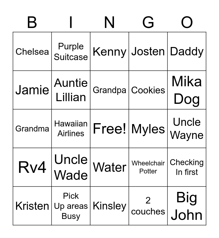 This bingo card has a free space and 79 words: Allie, Cate, Kenny, Kylana, Ryder, Riley, Lauren, Courtney, Cody, Tracyn, Reed, Jill, Josten, Chelsea, Bobby, Jamie, Auntie Cindy, Uncle Wade, Auntie Gale, Uncle Wayne, Mommy, Daddy, Grandma, Grandpa, Auntie Lillian, George, Mary, Daisy Dog, Harlee Dog, Kiko Dog, Mika Dog, Bugsey Dog, Kinsley, Khole, Kristen, Myles, Jaylee, Jacob, John, Big John, Darnell, Micah, Esa, Waimea Kauai, Lihue Airport, Purple Suitcase, Blue suitcase, Green Flowers Bag, Harry Potter Bag, Red Walker, Checking In first, Hawaiian Airlines, Wheelchair Potter, Haddicap Sticker, Pushed Walker, Tsa, Pat down, Restroom, News Stand, Water, Cookies, Restroom, Hawaiian Airlines, Potter Nice, Took Walker, Flight attendant Help, Gate 5, Our Flight Was empty, Honolulu Airport, Rv4, Pick Up areas Busy, Taco Bell, House, Upstairs, Down Stairs, 2 couches, Television, Air condition and Dog.