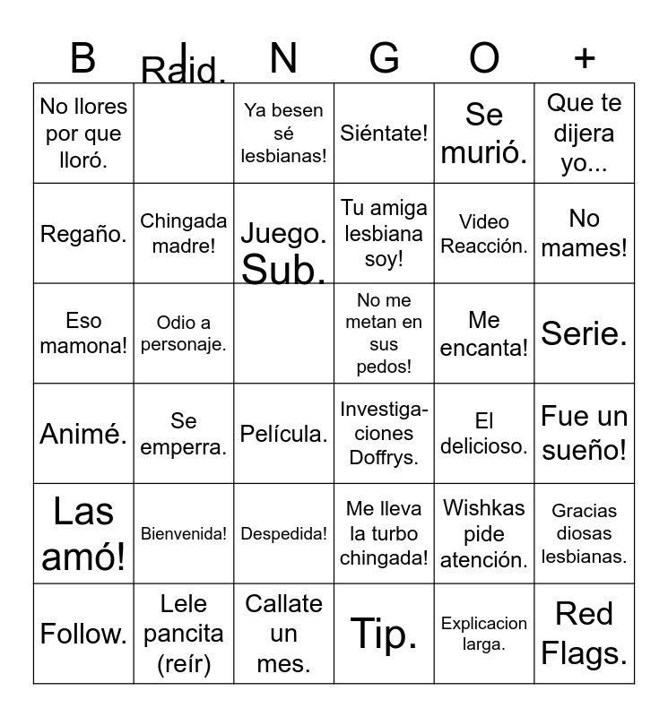 This bingo card has 36 words: Animé., Se emperra., Callate un mes., Tu amiga lesbiana soy!, Me encanta!, Serie., No llores por que lloró., Lele pancita (reír), Ya besen sé lesbianas!, Me lleva la turbo chingada!, Video Reacción., Que te dijera yo..., Las amó!, Odio a personaje., Juego., Siéntate!, Wishkas pide atención., Fue un sueño!, Regaño., Chingada madre!, Película., Investiga-ciones Doffrys., El delicioso., Gracias diosas lesbianas., Eso mamona!, Raid., Sub., Tip., Se murió., No mames!, Follow., Bienvenida!, Despedida!, No me metan en sus pedos!, Explicacion larga. and Red Flags..
